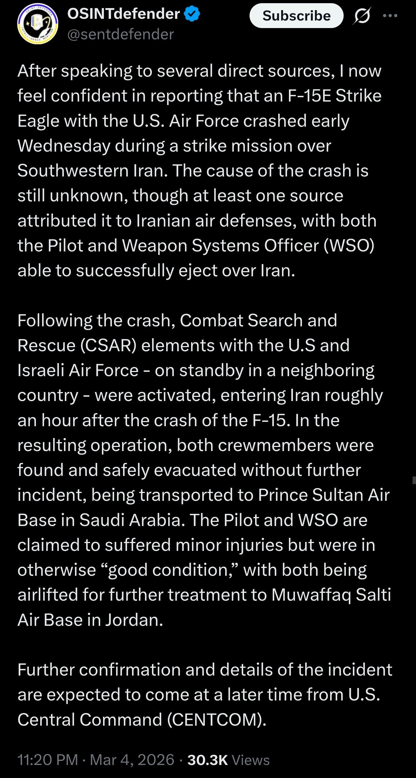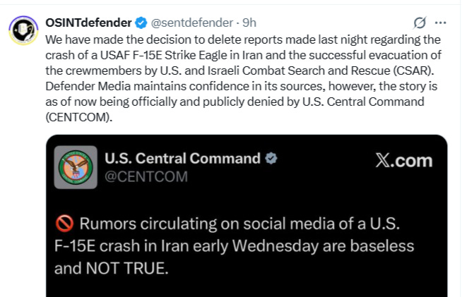 Two separate new reports of shot-down American F-15s hit the waves today as well, despite US denials. Again even top pro-American OSINT accounts were forced to admit their ‘trustworthy’ sources had confirmed at least one of the shoot-downs: