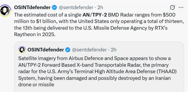 In particular, NYT and other outlets have now confirmed total attrition of US’s irreplaceable AN/TPY-2 radars meant for THAAD and other high end systems. This radar has an upwards of $1 billion dollar price tag and numbers only in the dozen range total. Only one or two units of these can be built per year at the very most. Iran just potentially destroyed 50% or more of the US’s entire global stock of this rare and irreplaceable system.