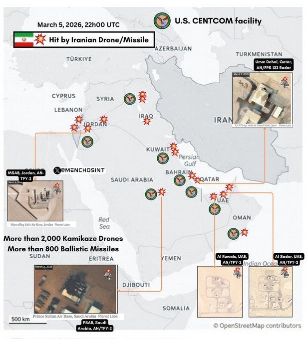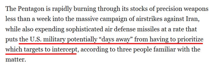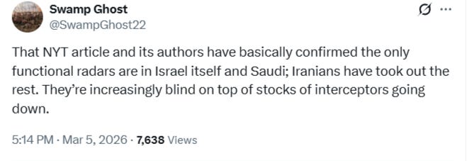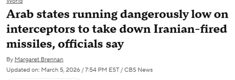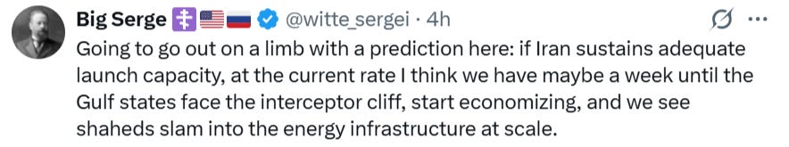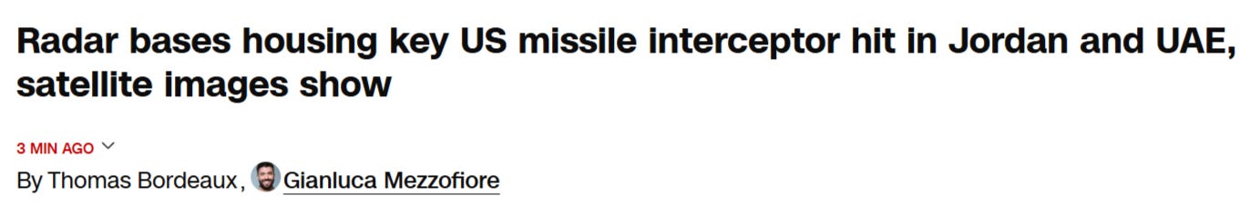 The above makes a plausible case: if Iran is not stopped now, it will have essentially learned to ‘undress’ the entire region, and the strategic assets it is now attriting are irreplaceable and will cripple the region’s ability to respond to threats for the foreseeable future. The same goes for interceptor stocks, which will not appreciably improve any time soon. Iran has uncovered a kind of escalation dominance over the US and its allies given that it’s able to produce cheap and ‘precise-enough’ weaponry much faster than US and its allies can restock their prestige systems, which puts them all in a major bind.