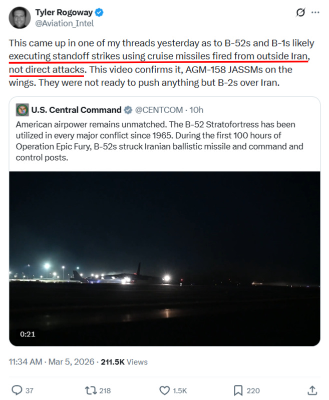 Amidst US fighter jet shoot-downs, recall that all talk of “air superiority” over Iran have been completely debunked as confirmation came that US continues to use long-range stand-off weaponry fired from outside Iran. Footage of B-52s armed with JASSMs emerged, rather than the much shorter-ranged JDAMs and GBUs. This was confirmed by top aviation expert and founder of TWZ.com Tyler Rogoway:
