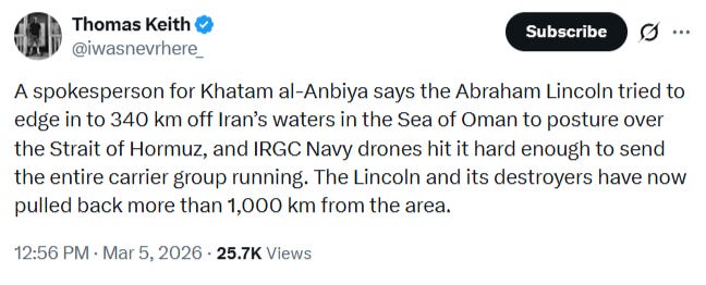 Today Iranian reports claimed that they had hit the USS Lincoln with some type of missiles, and that the ship had run away. OSINT accounts have tried to piece together the events, and though it’s extremely speculative, it seems the USS Lincoln attempted to move in toward Iran, having thought Iranian defenses—particularly its navy—had been attritioned enough for it to be safe. Instead, Iranian drones chased it away, though it’s uncertain whether it was actually hit or not: