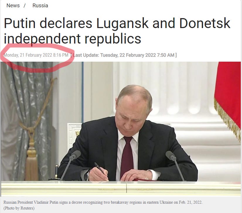 He gave full legal independence to Lugansk and Donetsk on February 21. Most people probably forgot about that little fact. This means that from this point on, in the eyes of the Russian constitution, not only would Lugansk/Donetsk be sovereign states with whom Russia can now sign any number of military/economic/civil agreements, but it also opened up the path to the eventual full annexation of these republics into Russia anyway, SMO or not.