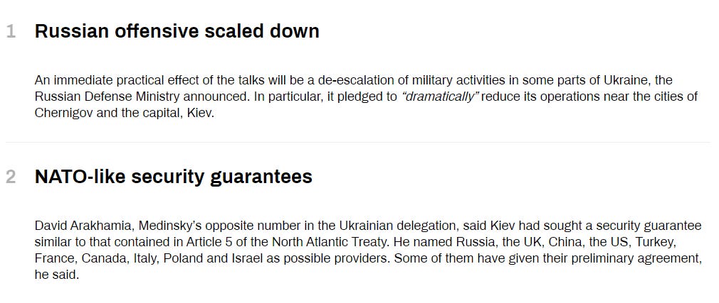 The biggest unresolved question that would cinch the above hypothesis for me, is what territory, exactly, was part of the agreement. I haven’t been able to find any definitive confirmation of this. One MSM article claims that Russia agreed to go back to its February 23 position. This would mean giving up all of Mariupol and the Crimean land bridge corridor that Russia had already captured by early March (not to mention Kherson). I would find it difficult to believe Putin would give that up. However, let’s say that was in fact part of the deal, then it would confirm my above hypothesis that Russia felt itself to be in a pretty poor position militarily.
