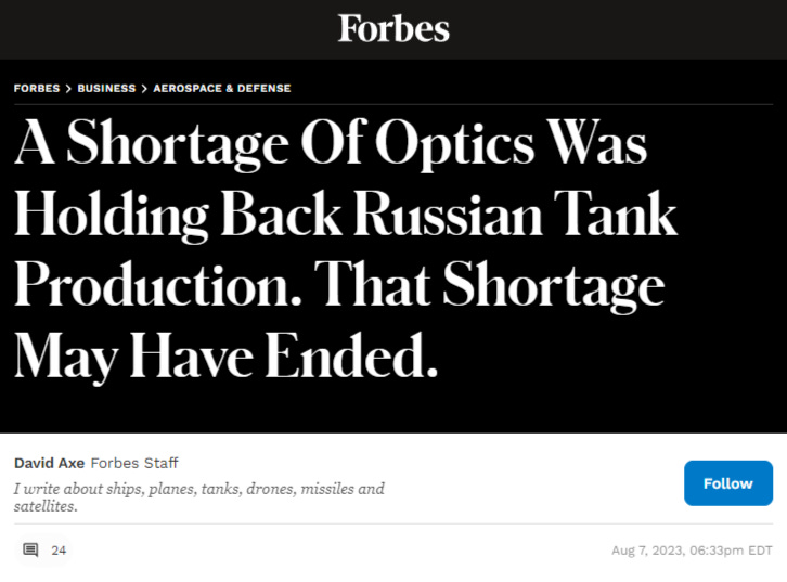 Last month Forbes lamented that Russia’s only remaining bottleneck for mass tank production has ended: