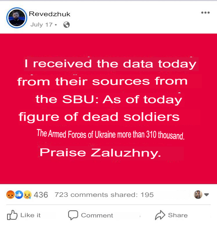 I had forgotten to post this a while back. Ukrainian journalist Roman Revedzhuk who had previously run for office and was involved in Ukrainian politics for a long time revealed that he had received an insider report from the SBU that Ukraine had more than 310,000 KIA as of July: