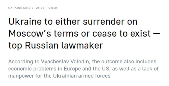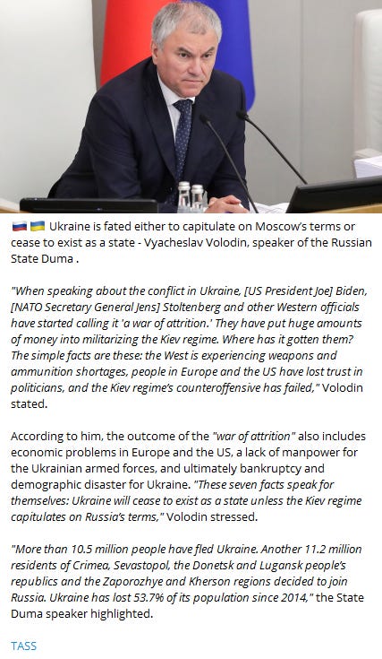 On this note, Russian State Duma Speaker Vyacheslav Volodin reinforced some of my recent reporting, that Ukraine’s fate is either total capitulation and surrender to Russia or…complete destruction: