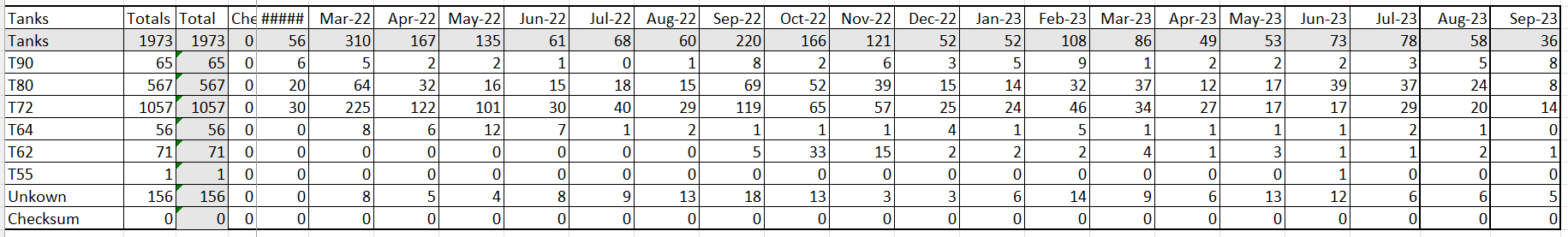 Lastly, a chart was put together attempting to derive some sense from Russia’s tank losses, whether for instance they were running out of certain hulls like the premier T-72/T-80 and replacing them with old T-62s and T-55s as so many Ukrainian propagandists claim: