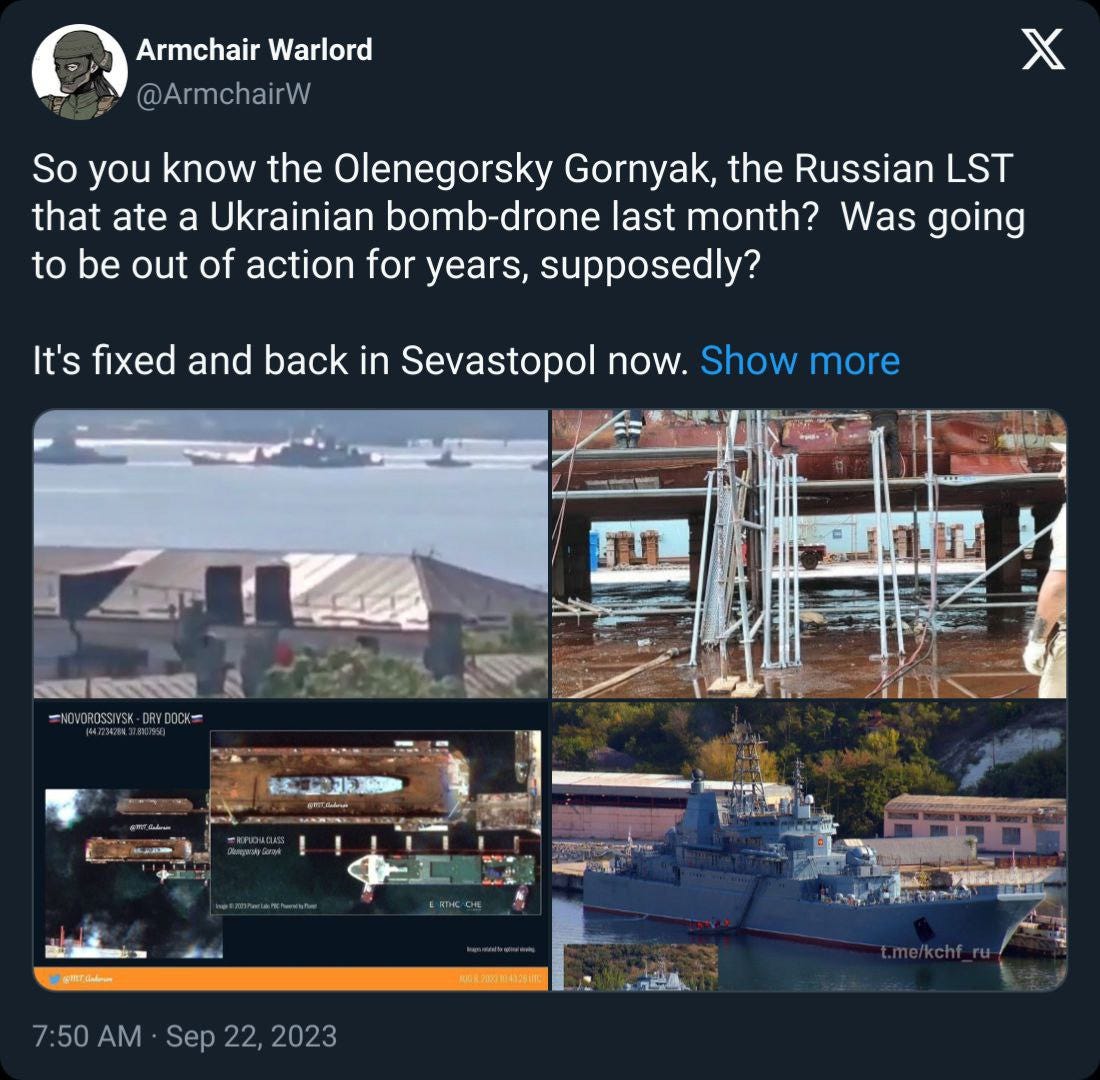 I’ve already covered this a bit. One interesting thing to note is that the Russian landing ship Olenegorsky Gornyak, previously struck by Ukrainian naval drone, has already returned to service after a faster-than-expected repair:
