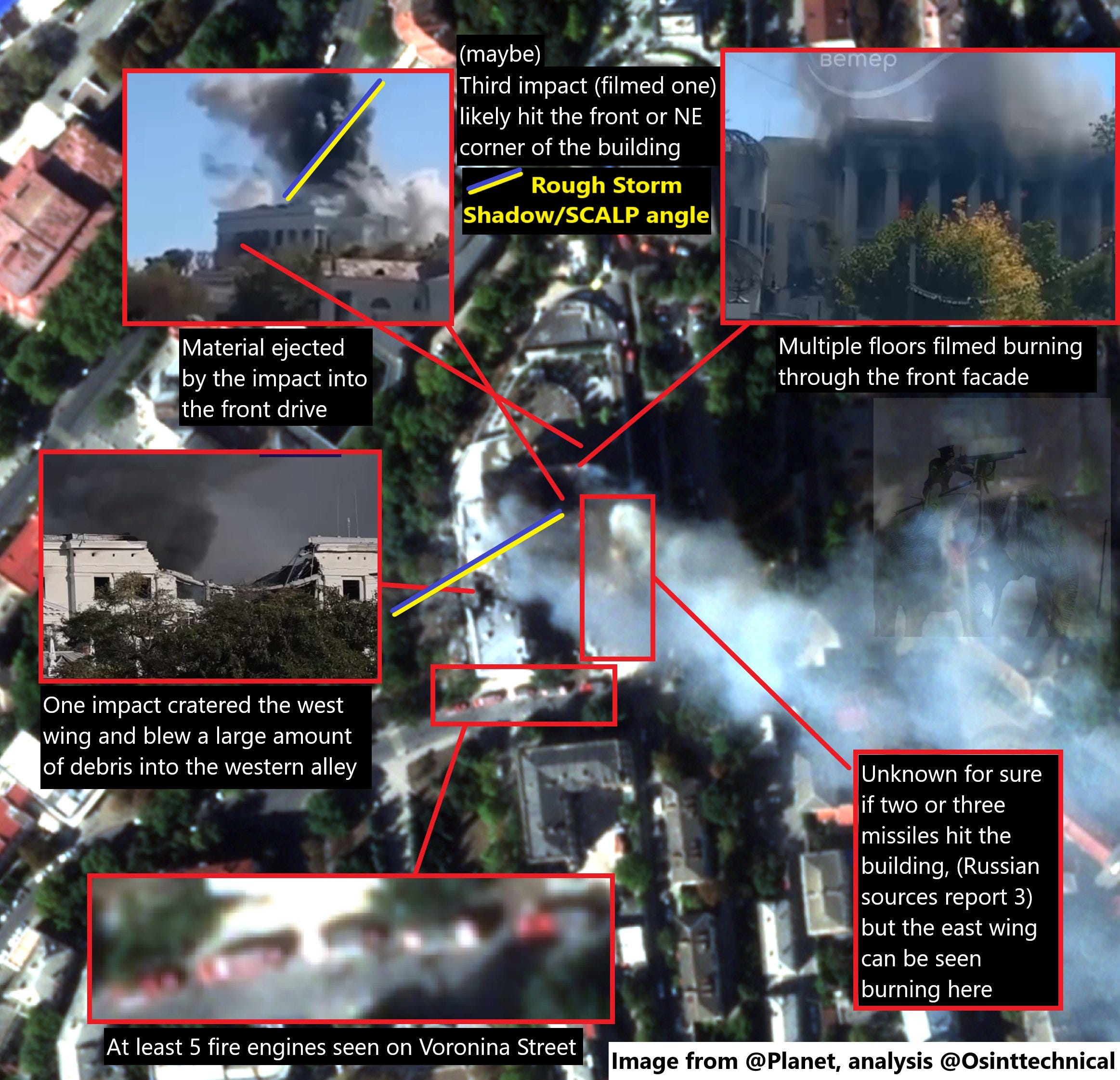 Russian MOD claims that 7/10 missiles were shot down. This is likely true as other eyewitness videos like the above have depicted many explosions in the sky, sounds of air defense intercepting missiles, while the post-op BDA satellite photos showed only 2 or maximum 3 strikes were inflicted on the building itself: