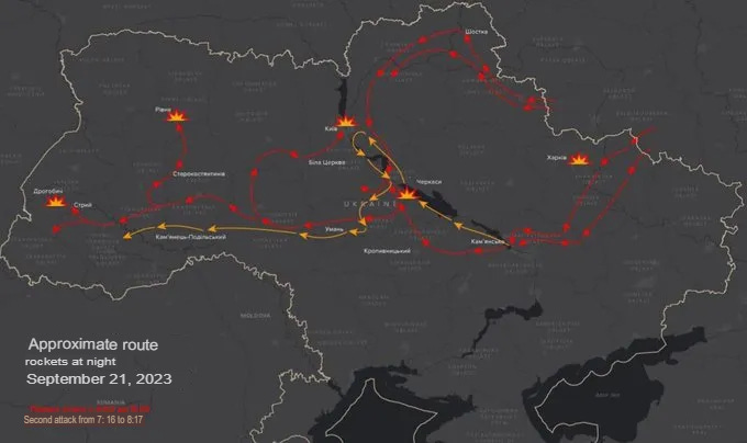 On top of that, Ukraine has complained that Russia’s recent strikes are becoming increasingly complex (well, so are the Ukrainian ones for that matter). Here are two maps from Ukrainian sources showing the bizarre, circuitous routes Russian missiles are being programmed to take: