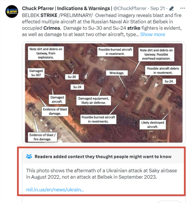 There were also some fake attacks which were completely refuted. In order to maximize and amplify the propaganda effect from the couple successful ones, pro-Ukrainian bot accounts spread several other alleged attacks on Russian airfields in Crimea. One of them was even debunked by a Twitter community note: