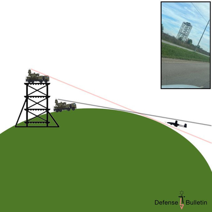 We know from past reports that a Russian S-300/400 system exists somewhere on that Tarkankhut peninsula of Crimea, where the drone icon is on the above map. This is an area that “juts out” and should give forward coverage of the Black Sea. The problem is, as I explained last time, low flying missiles allow radars to only spot them at most at something like 30-40km. This is irrespective of how powerful a radar system is—it’s down to the simple physics of how radar horizons work.