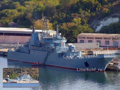 Let’s turn to that strike next and work our way up to the recent hit on the Black Sea Fleet HQ. The Ropucha class landing ship Minsk and Kilo class sub Rostov-on-Don were struck.