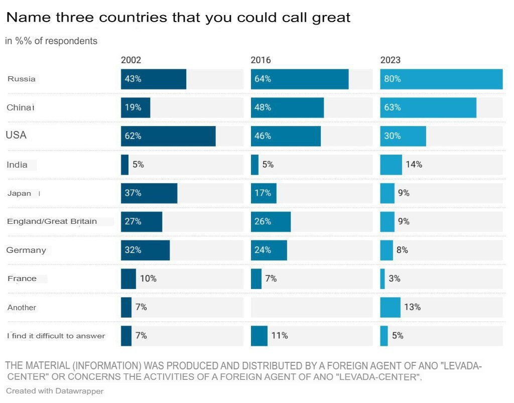 In 2002, more Russians considered the U.S. great than their own country, and thought next to nothing of China. Now the majority considers China great and the U.S. has been relegated from ‘great’ to ‘second rate’.