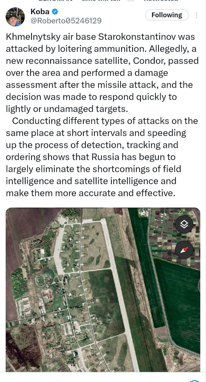 In fact, during the past day or two, Russia has struck a number of Ukrainian strategic objects and airfields. Dolgintsevo wasn’t the only one. The Bolshaya Kakhnovka airfield in Kremenchug was said to be obliterated. The Starokonstantinov in Khmelnitsky, where Ukraine houses the majority of its Su-24s, was struck again: