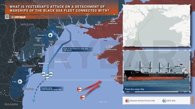 What is the reason for yesterday’s attack on Russian Navy ships? Today, the ship “Puma” under the flag of the Cayman Islands left the port of Odessa and headed along the already tested route along the coast of Ukraine to the south. The ship is still en route and is heading along Romania, probably towards the Bosphorus. Before entering Romanan waters, the ship was accompanied by two boats of the Ukrainian Navy, MiG-29 fighters patrolled the airspace over the Odessa region, and American P-8As were working in shifts over Romania (one of them was mistaken for a B-52).