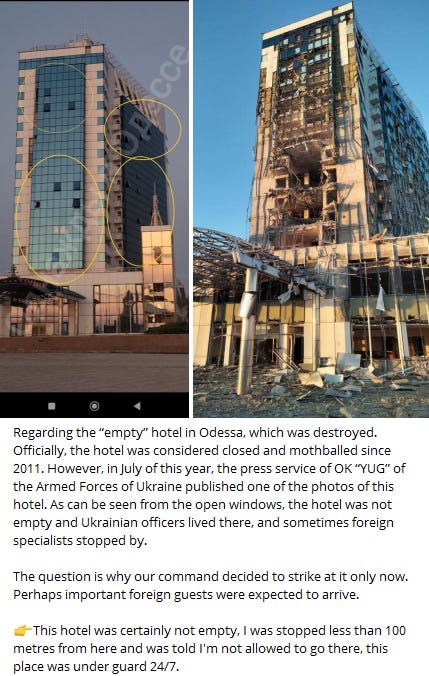Now, following the Sevastopol strikes, Russia has struck a devastating blow on Odessa, seemingly in reprisal. The Odessa hotel is claimed to have staffed many mercenaries and acted as a Ukrainian command HQ after a previous HQ was destroyed: