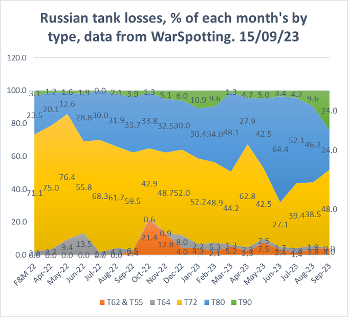 For Ukraine it’s the opposite. The only thing seen anymore are T-64s and older stuff. Few T-72s are seen and each time a new tiny injection of NATO tanks arrives, they are promptly obliterated: