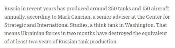 50-70 tanks lost per month is not bad at all. This averages to somewhere like 2 per day which would be about 600-700 per year. The reason that’s good news is because that’s under what Russia is now producing yearly, which means the tank losses are sustainable—that’s the most important part.