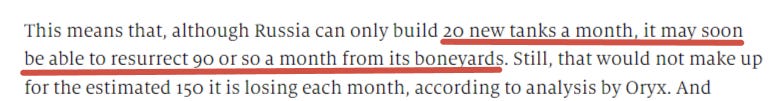 Now, multiple sources like The Economist claim Russia produces 20 brand new tanks per month and up to 90 refurbs: