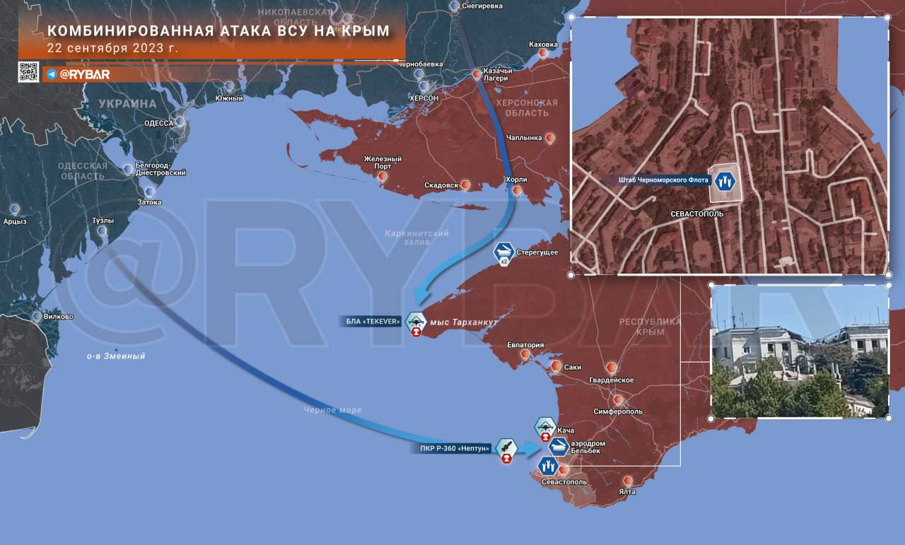 At the same time, reconnaissance groups of Medvedi PMC noted that two Su-24M, flying low about 40 m above the water, conducted launches over the Black Sea. Ahead of this, Ukrainian planes fired three AGM-160 MALD decoy missiles to mislead air defense. Pantsir-S1 air defense crews of the 31st Air Force and Air Defense Division shot down five cruise missiles over Cape Tarkhankut and the Belbek airfield. 3 Storm Shadows fell in the Verkhnesadovoye area - the target was likely a former military facility near the village. A few hours before the attack, a reconnaissance drone of an unknown type took off from Kherson, which, rounding Cape Tarkhankut, set up a patrol area west of Kacha and directed aircraft. It is highly likely that it was shot down by air defense systems.