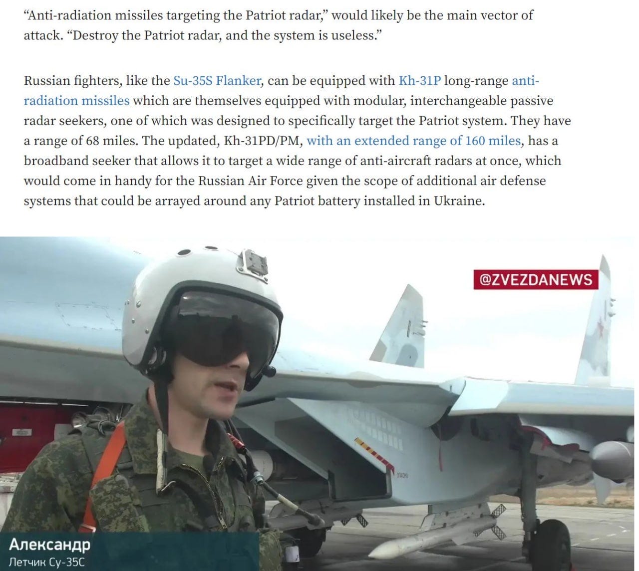 Firstly, there could be Russian Sukhois armed with Kh-31P anti-radiation missiles which do have a range of 110km, and even 160km+ for the latest PK variant. They could safely fire these missiles from over the Russian border onto the most powerful radiating source which would be the Patriot’s AN/MPQ-53/65 radars.