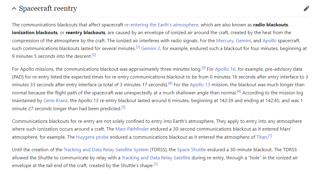 As you know, any NASA space capsule during reentry undergoes a completely ‘radio blind’ period where no communications are possible. This is precisely the reason why: the vehicle is going hypersonic speeds as it tries to decelerate down, and during this time a plasma bubble completely encompasses it, blocking all signals.