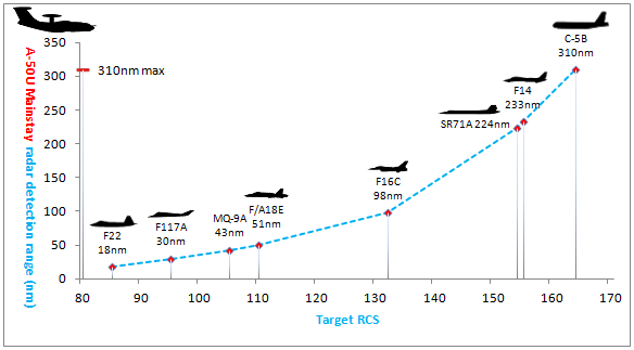 As can be seen by the rough chart above, the A-50U can detect something like an F-16 at 98 nautical miles or 180km. But this is a small RCS target it’s detecting with its own radar waves. The Patriot battery would be giving off massive radar signals probably equivalent to several gigantic RCS bomber planes, if not more. This would give it the equivalent detection range of the absolute end of the spectrum.