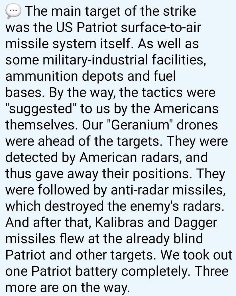 Our source in the OP said that the Patriot system was damaged, 2 Patriot Launching Station -3 and a Patriot Radar Set were destroyed. 5 soldiers were killed, of which two were foreign instructors, all Western air defense systems are supplied to Ukraine with technical personnel who help our specialists use the anti-aircraft system.