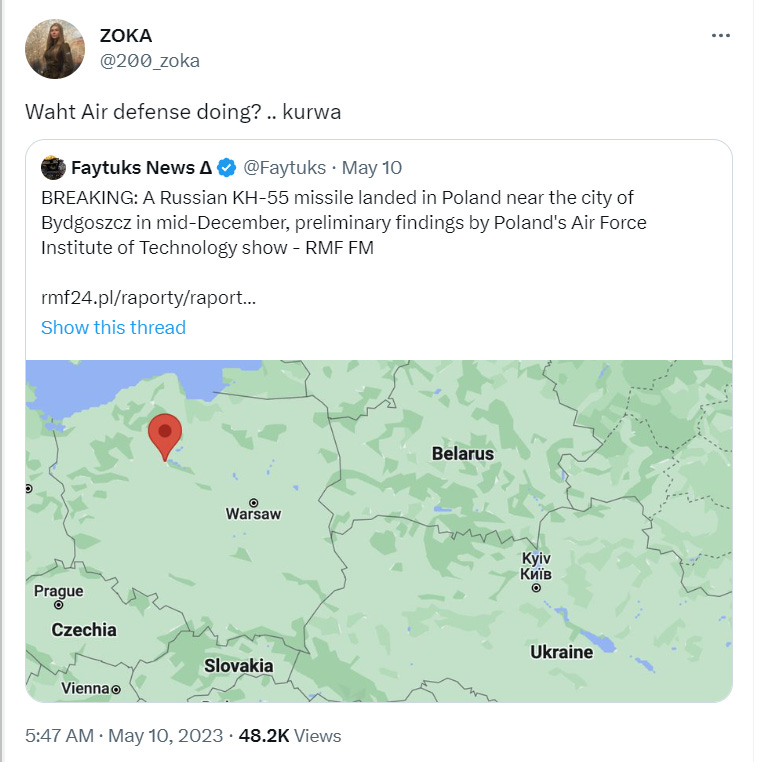 This should come as no surprise. Just a few months ago a Russian Kh-55 missile was reportedly found in far western Poland. These are the oldest, slow and highly non-stealth missiles which Russia typically rolls out as decoys, to screen for their newer and much more advanced Kh-101s.