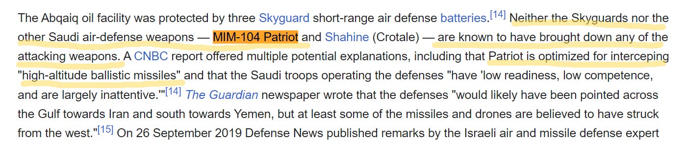 In the Abqaiq–Khurais attack in Saudi Arabia the Patriot failed to stop any missiles, and again, excuses were manufactured: