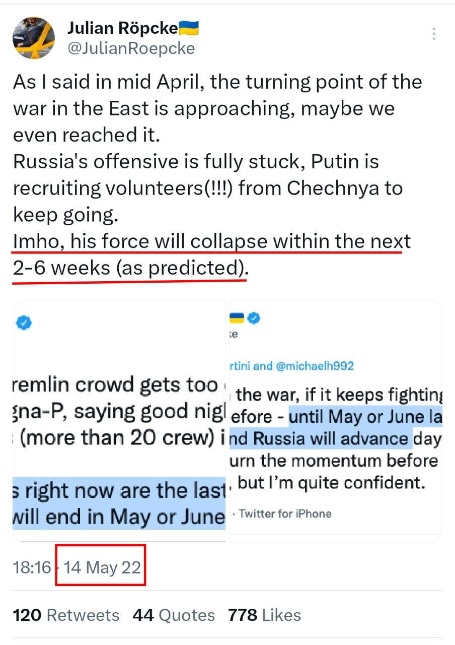 No leader should prolong it needlessly, and Putin has. Additionally, his wimpiness has resulted in a long and escalating series of violations of supposed red lines leading, unsurprisingly, to rumors that nuclear weapons will actually be introduced after numerous attacks on Russian soil and even the nuclear triad. Preventing this was the absolute ultimate goal of the war. None of this absolves the west of its guilt, of course.
