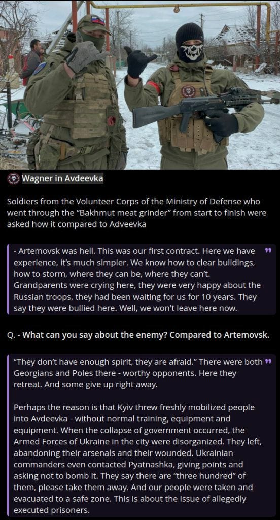 Soldiers from Wagner who fought in both Bakhmut and Avdeevka indirectly support this assertion as they’ve recently stated that it was easier in Avdeevka as Ukrainians much more often simply fled rather than putting up a fight: