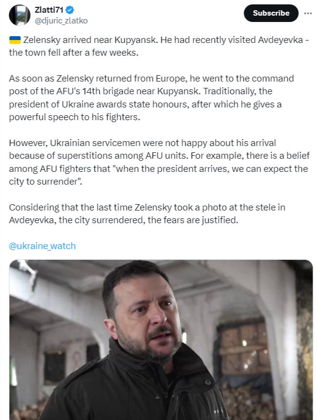 But to those understandable critics I ask again: have you really ever seen the situation as it currently is? What part of last year or the year before have we seen lines breaking on literally every front? The situation is clearly tangibly different despite some surface level similarities of the seeming ‘endless deterioration’ of the AFU. And let’s not forget: their aid has totally stopped—this is unprecedented, and a very precipitous collapse can happen in the next few months if emergency aid is not subvented.