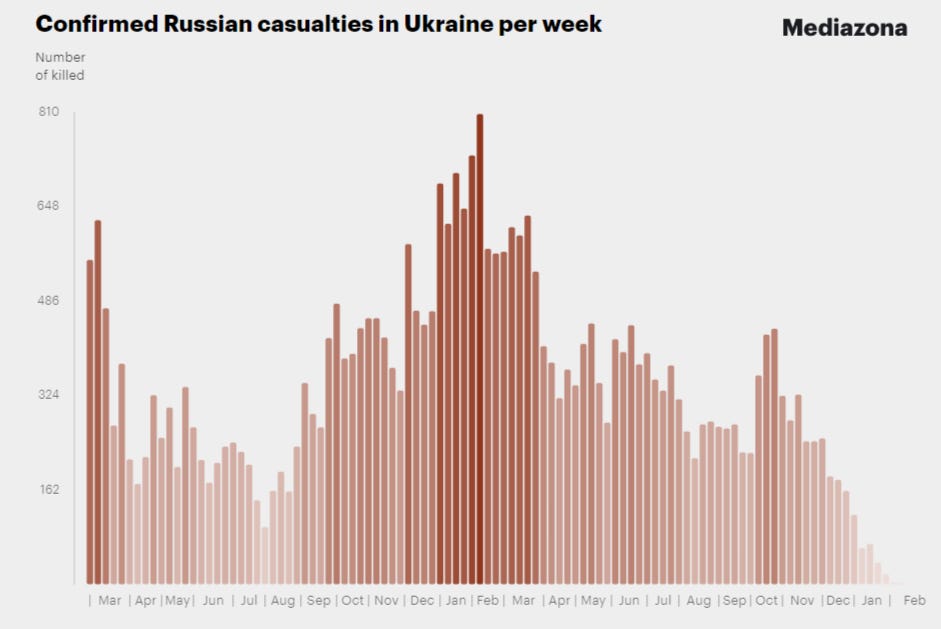 Ultimately, MediaZona has Russia averaging something like 200 weekly dead across the entire war since early October, when the Avdeevka offensive began.