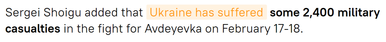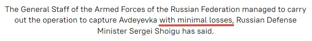 And as for Russia? Shoigu reported the final capture of Avdeevka happened with “minimal losses” on the Russian side: