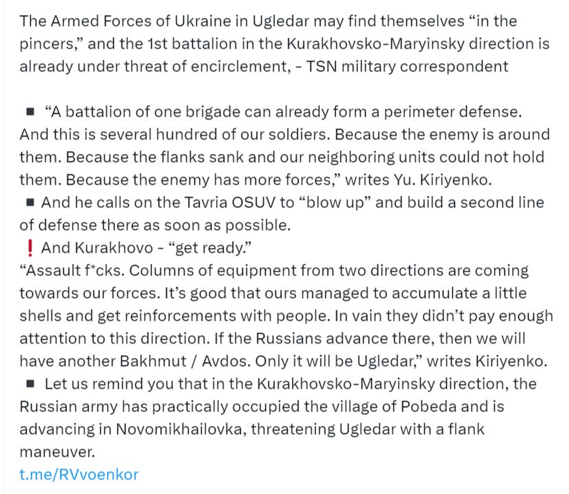 Ukrainian correspondents are urging attention to this area as Kurakhovo is next in the crosshairs and Ugledar may soon become enveloped: