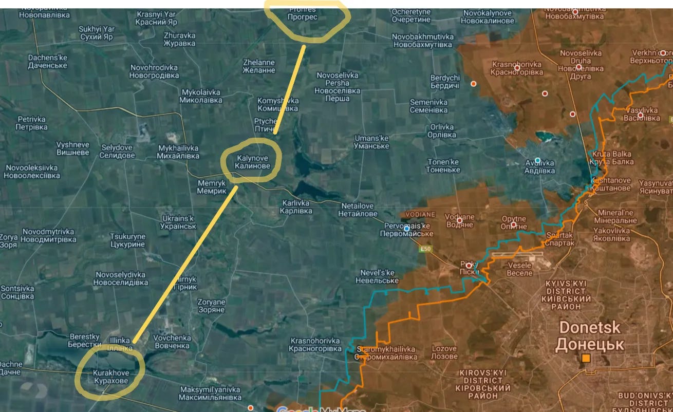 The useful map above shows the water source (map is slightly outdated from right before Avdeevka capture, so ignore that). I point this out because, as you may recall, in a report 10 days ago I outlined how Ukraine is building its second echelon defensive line roughly along that Vovcha River, from Kurakhovo to Prohres/Progress. To use the older map from that previous report: