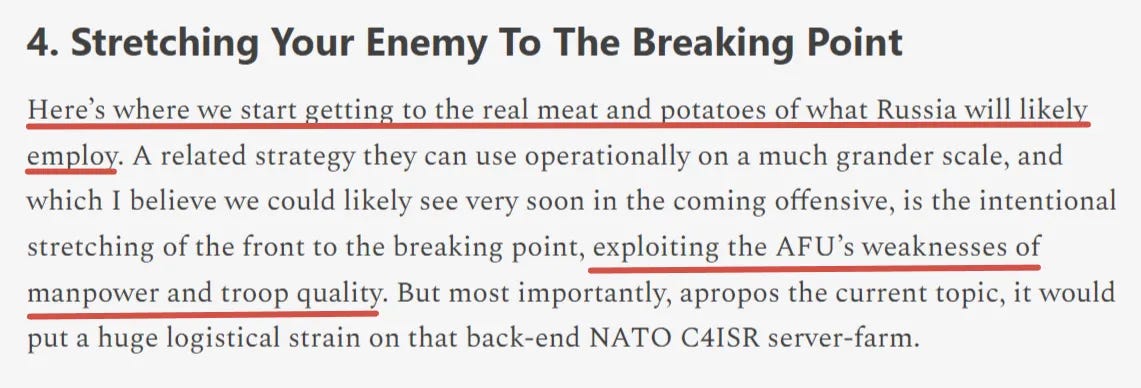 Taking into account everything I said above and in the rest of the paid article regarding Ukraine’s NATO ISR overmatch plus the prevalence of drones in general and how they’ve vastly limited maneuver warfare, we know that the only way to truly win is to stretch your enemy on every front and defeat him in detail while bringing to bear your greater logistical and economic resources.
