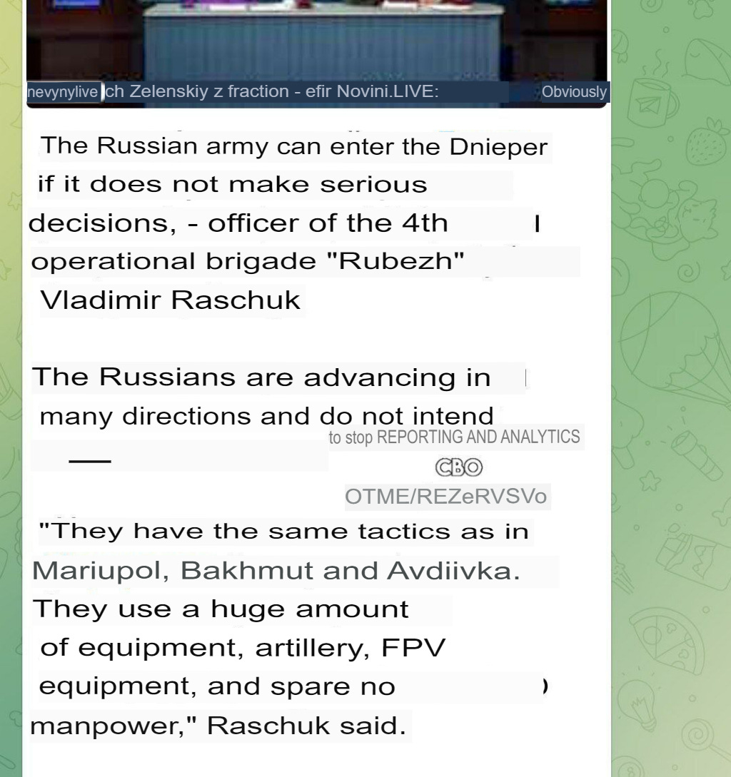 The auto-translation messes up a little at the end, but he essentially states that “Russia is rotating troops back and forth everywhere, from Avdeevka, Kupyansk, Rabotino, etc.”