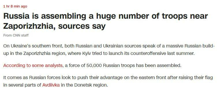 Another point of focus of the Russian Armed Forces is Rabochino, where events are taking place right now, and the AFU command considers this area to be the most tense, and the concentration of Russian forces is more than near Avdiivka. Another 100 thousand Russian soldiers are gathered in the area from Kremennaya to Kupyansk.The BBC, meanwhile, already writes that the fall of Avdiivka will mark the biggest change in the front line since the battles for Bakhmut and will have a much stronger impact on the situation than the same Bakhmut.