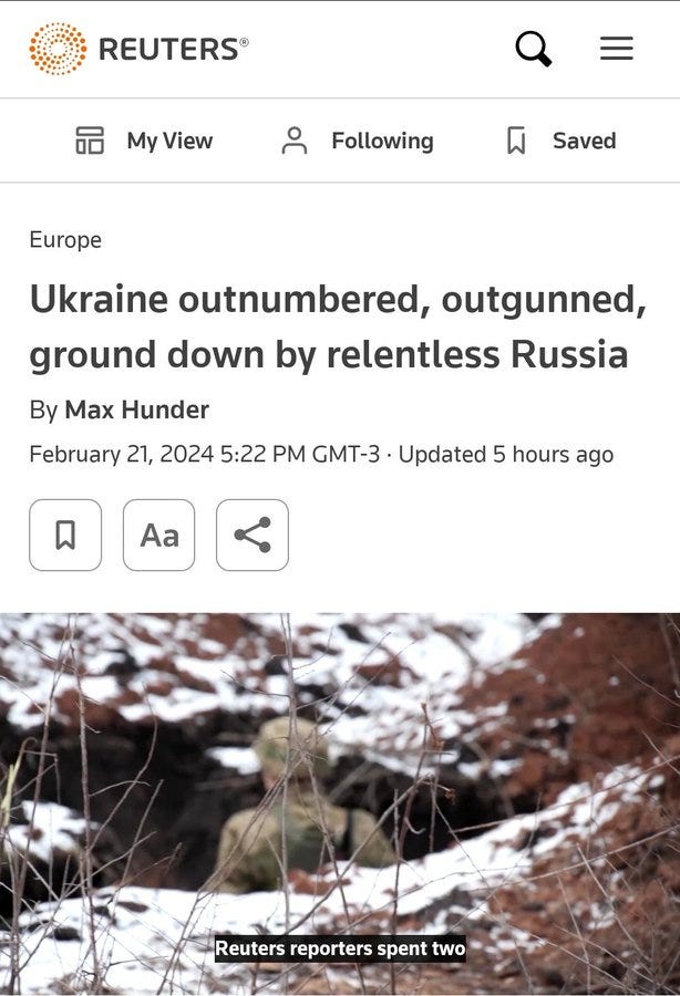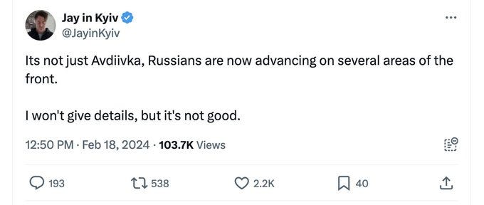 It would be one thing if these circumstances presided under the promise of soon-to-come aid or massive mobilization. But the problem is, full-scale societal mobilization has failed, and Ukrainian citizens have a historically low confidence for victory, as well as tolerance for forced recruitment, as recent polling shows. Likewise, aid is no where nearer, and as you’ve seen from the recent articles and statements from officials, a “catastrophic” situation is being predicted for late March and onward.