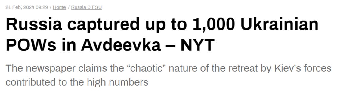 So why is this so shocking? Beyond the simple admission of such a huge amount of captures in merely a day or two, the most profound thing is that it confirms Russian figures, which I reported last time. I wrote that Russian sources said at least 500+ had been captured, and pro-UA accounts had scoffed at this number. Thus, if this proves that Russian estimates of captures were accurate, it means Russia’s other even more critical figures are likely accurate as well—for instance, about total AFU losses in Avdeevka.
