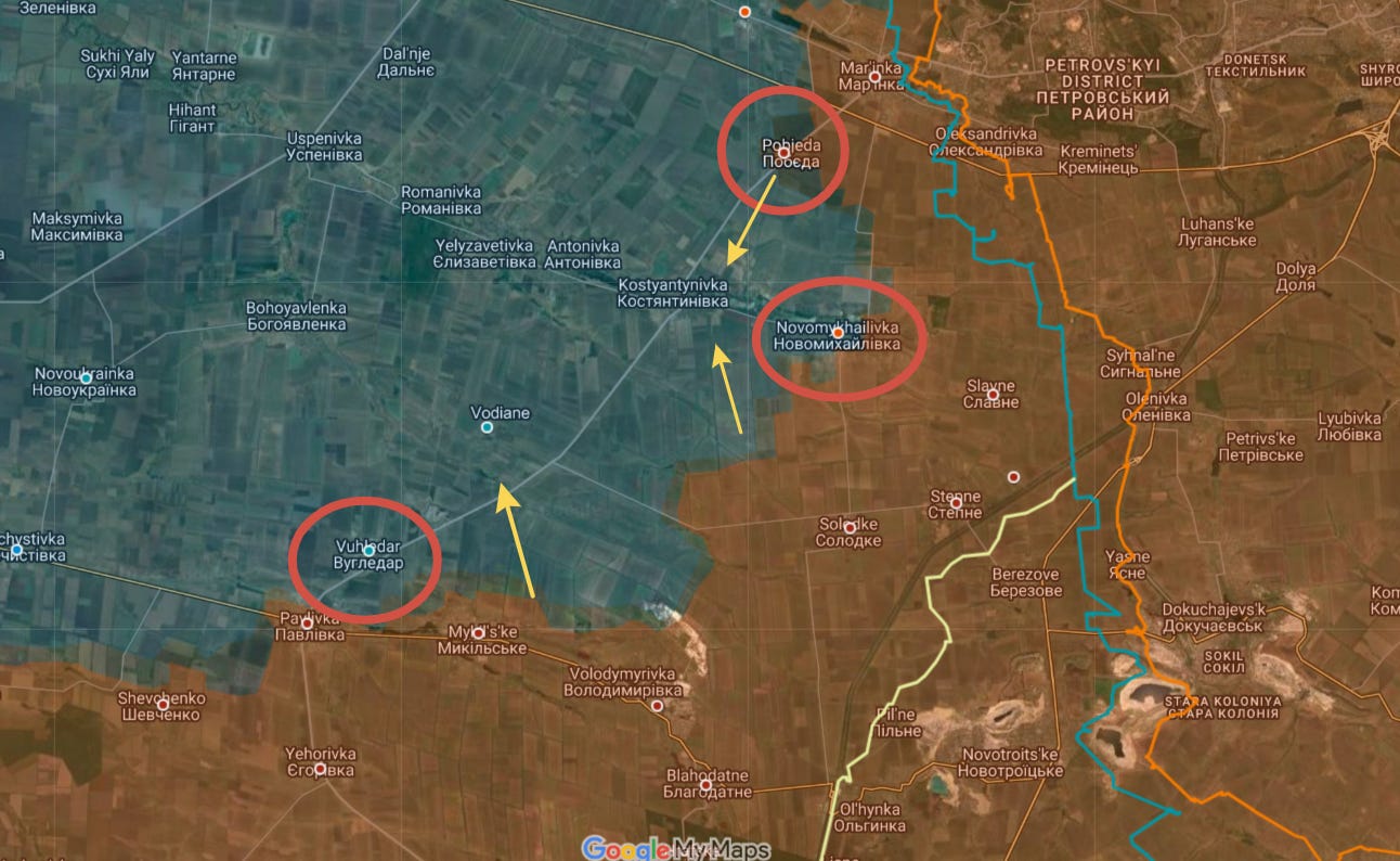 Firstly, Ugledar is slowly being cut off at its most important supply routes by the undermining of Novomikhailovka with the recent capture of Pobeda—all three seen circled here for better visualization: