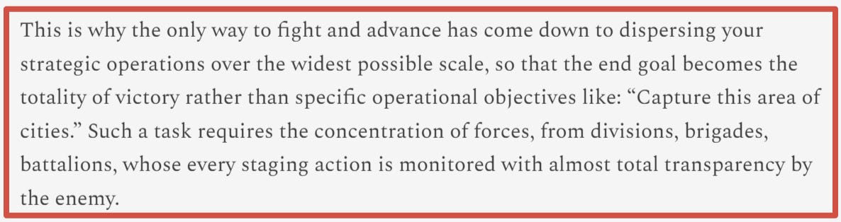This is why the only way to fight and advance has come down to dispersing your strategic operations over the widest possible scale, so that the end goal becomes the totality of victory rather than specific operational objectives like: “Capture this area of cities.” Such a task requires the concentration of forces, from divisions, brigades, battalions, whose every staging action is monitored with almost total transparency by the enemy.