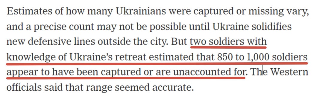 But the most shocking report came from NYTimes which stated that soldiers close to the action confirmed upwards of 850-1000 AFU were captured during the chaotic retreats: