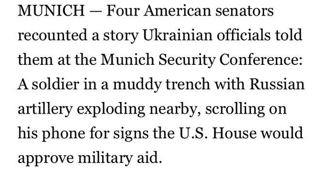 This culminated in a new Politico report that even claimed that Ukrainians are getting shelled in their trenches while scrolling their phones for updates on the Congressional aid package: