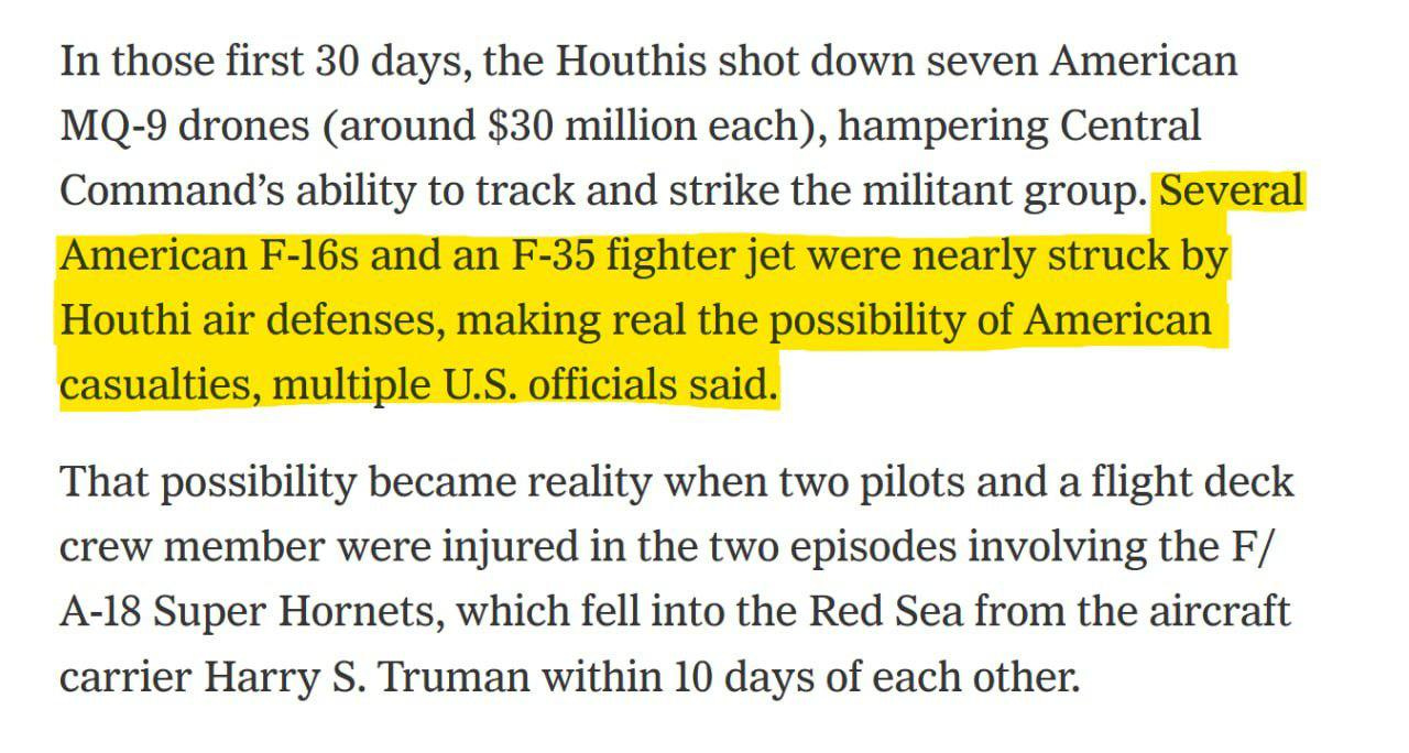 Additionally, citing unnamed U.S. officials, an unspecified amount of F-35 and F-16 fighter jets were nearly downed by Houthi air defenses in the same time period. While U.S. pilots are well trained enough to be able to evade, counter, and/or defeat incoming surface-to-air missiles, the article detailed the looming possibility that a U.S. pilot could be shot down, killed, or captured.