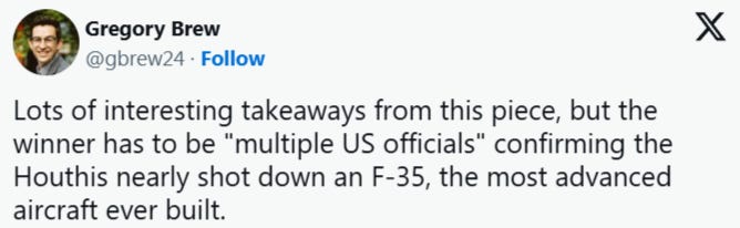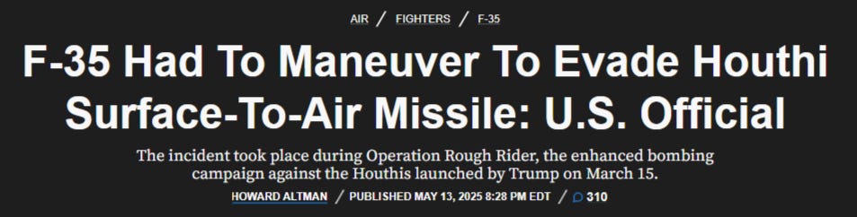 But of course, the most shocking of the article’s admissions that has everyone in fantods relates to how an American F-35 was reportedly nearly shot down by Houthi air defenses. The strike came so close that the F-35 had to take evasive dodging maneuvers: