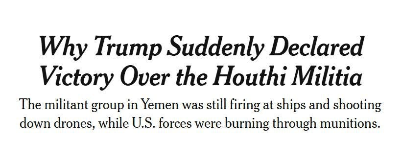 As we know, the Houthis then caused the USS Truman to lose two F/A-18 Super Hornets, valued at ~$70M each. NYT writes that by then, Trump had had enough.